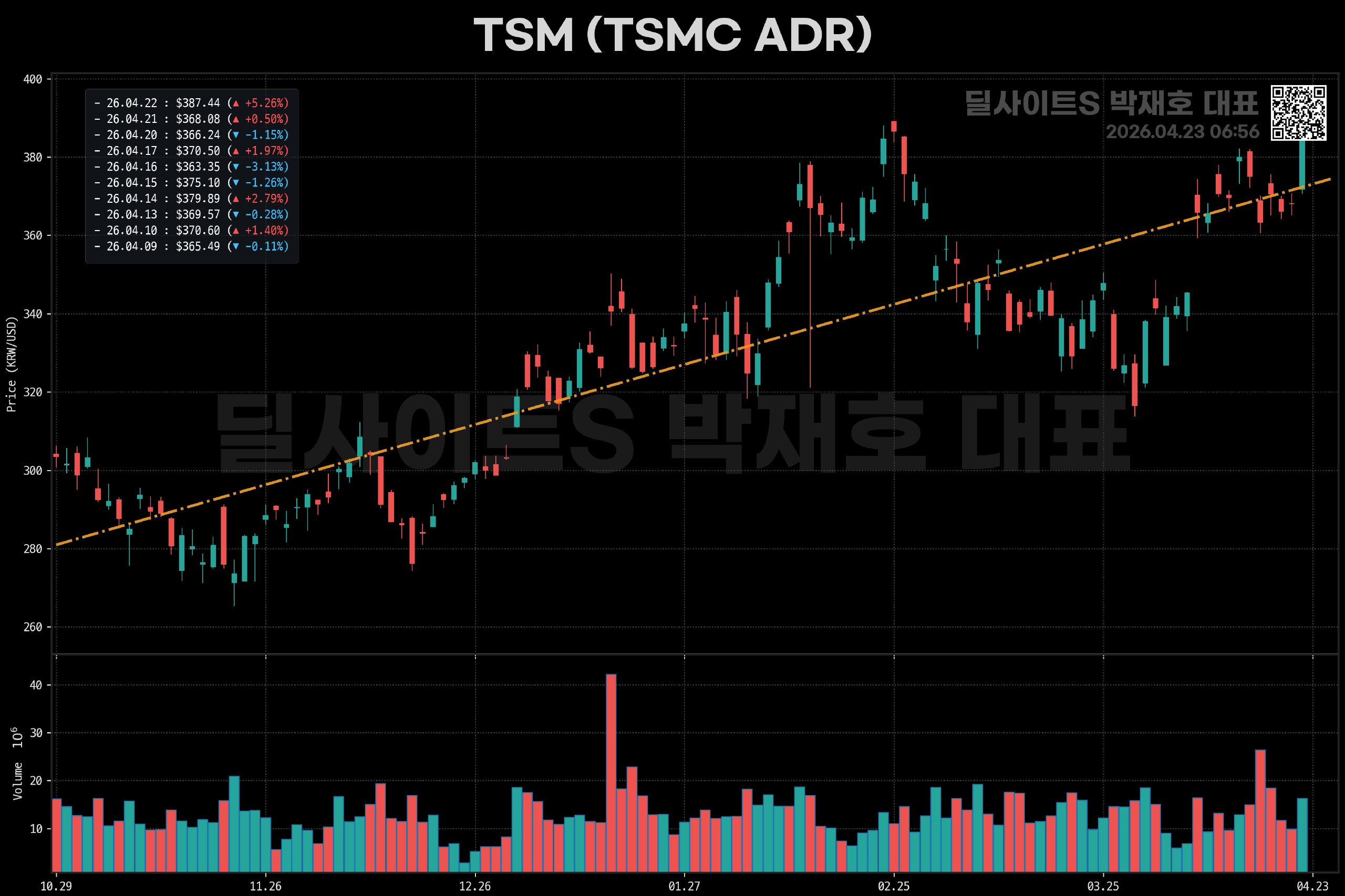 `TSM (TSMC ADR) $387.44 (🔺+5.26%)`