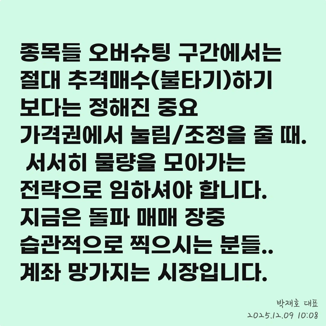 종목들 오버슈팅 구간에서는 절대 추격매수(불타기)하기 보다는 정해진 중요 가격권에서 눌림/조정을 줄 때. 서서히 물량을 모아가는 전략으로 임하셔야 합니다. 지금은 돌파 매매 장중 습관적으로 찍으시는 분들.. 계좌 망가지는 시장입니다.