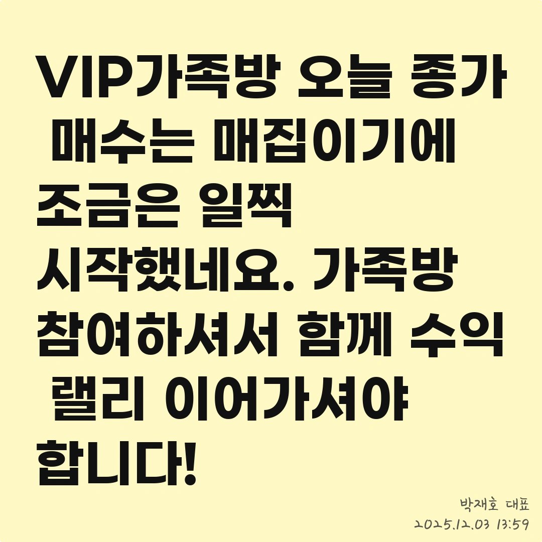 VIP가족방 오늘 종가 매수는 매집이기에 조금은 일찍 시작했네요. 가족방 참여하셔서 함께 수익 랠리 이어가셔야 합니다!