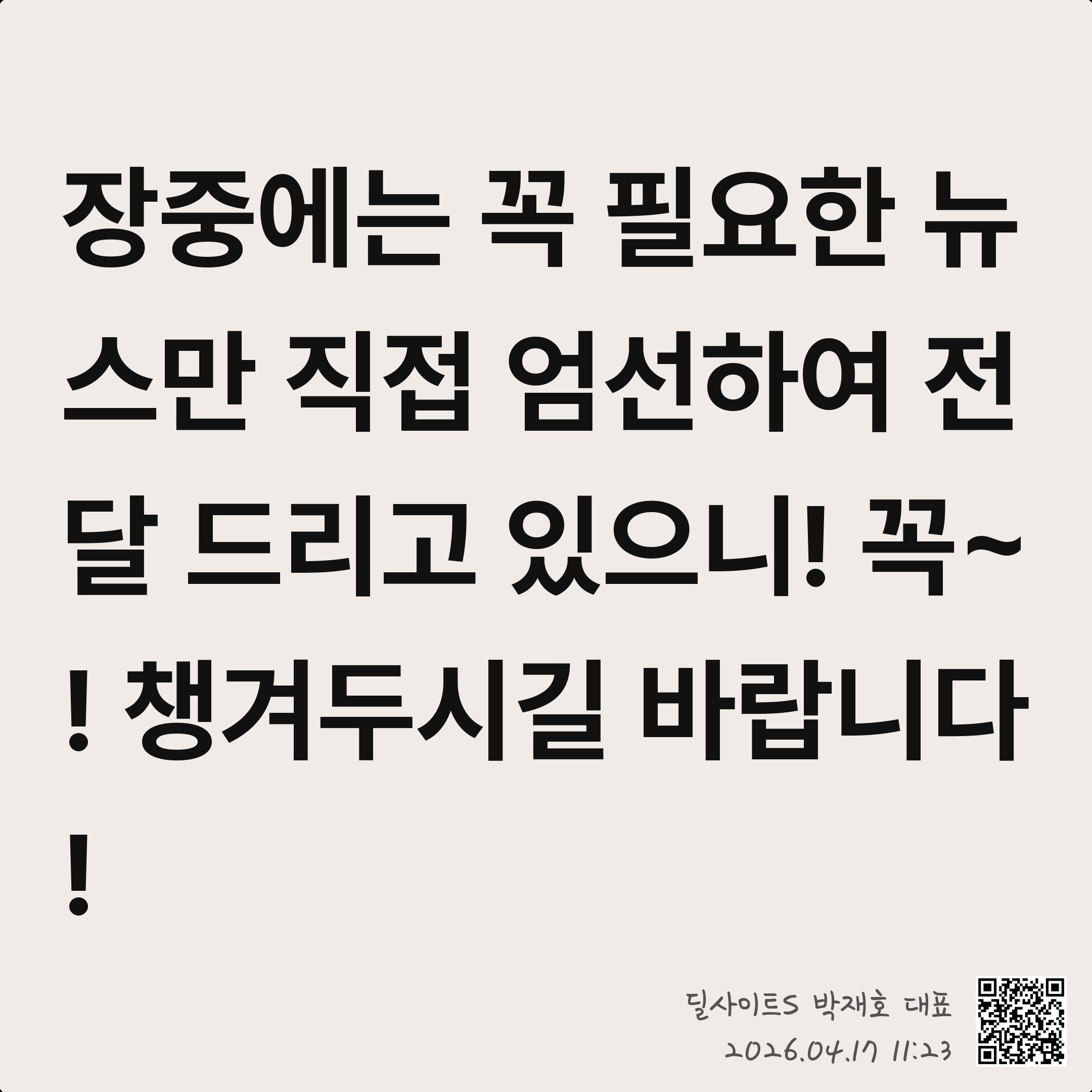 장중에는 꼭 필요한 뉴스만 직접 엄선하여 전달 드리고 있으니! 꼭~! 챙겨두시길 바랍니다!