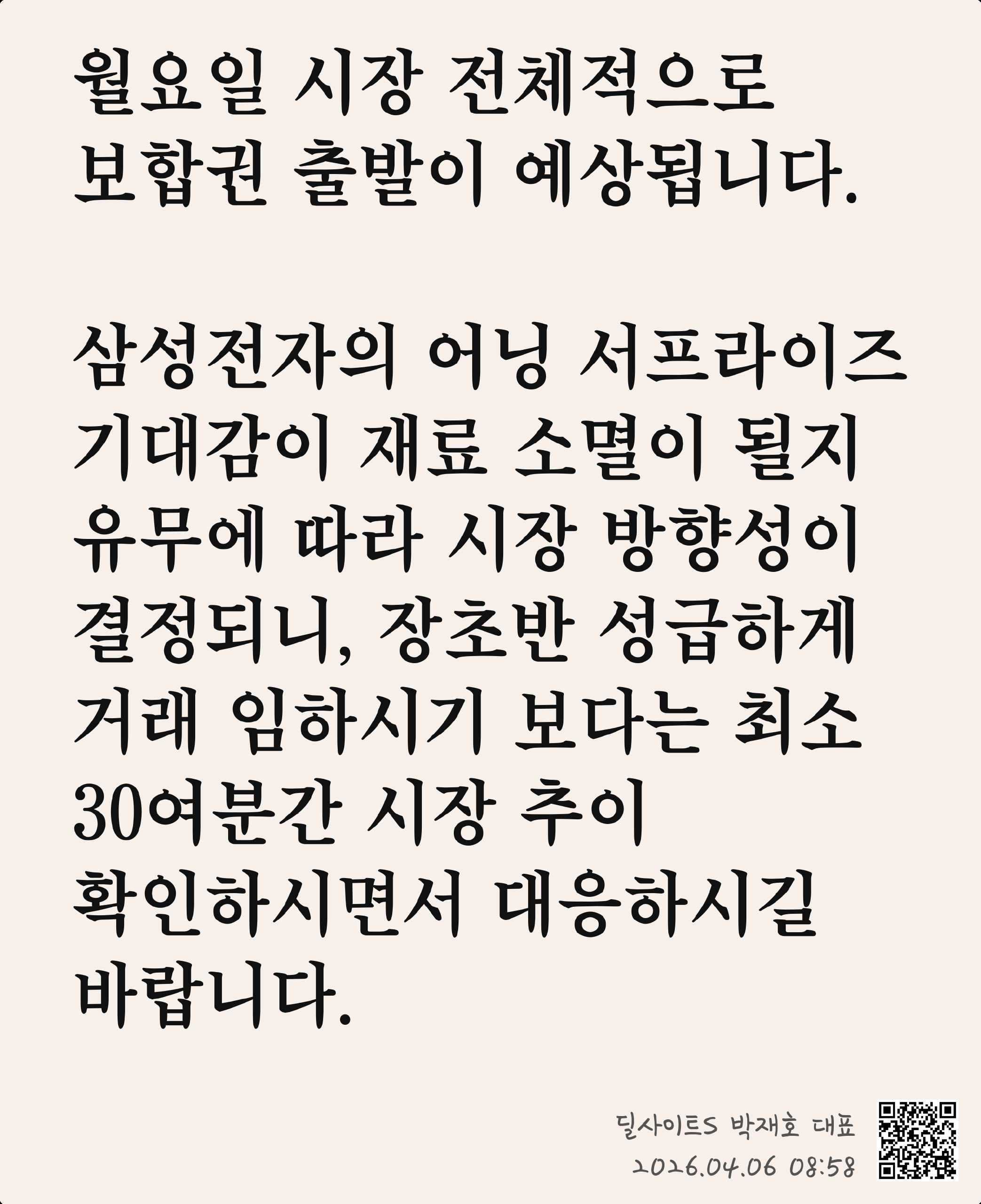 월요일 시장 전체적으로 보합권 출발이 예쌍됩니다. 삼성전자의 어닝 서프라이즈 기대감이 재료 소멸이 될지 유무에 따라 시장 방향성이 결정되니, 장초반 성급하게 거래 임하시기 보다는 최소 30여분간 시장 추이 확인하시면서 대응하시길 바랍니다.