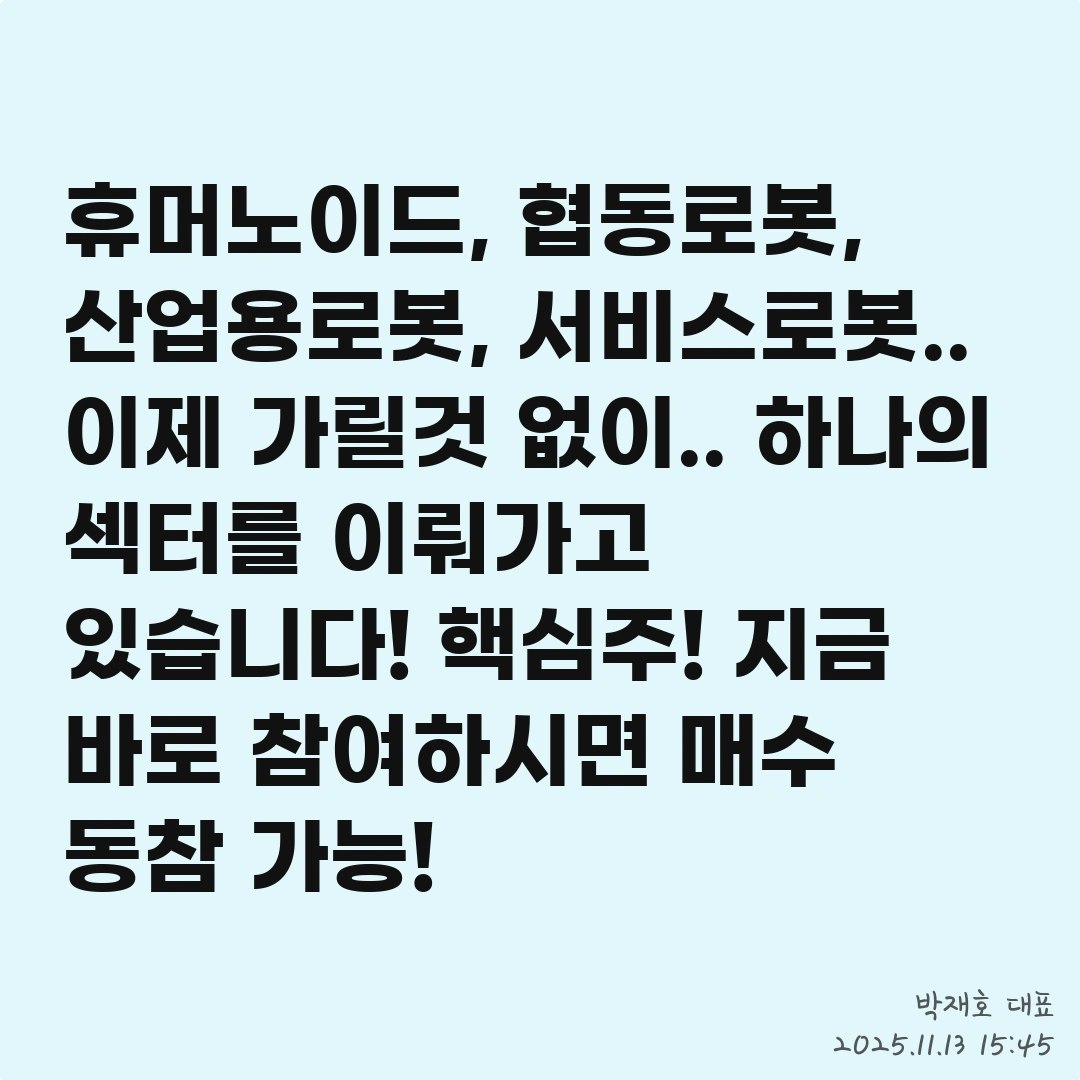 휴머노이드, 협동로봇, 산업용로봇, 서비스로봇.. 이제 가릴것 없이.. 하나의 섹터를 이뤄가고 있습니다! 핵심주! 지금 바로 참여하시면 매수 동참 가능!