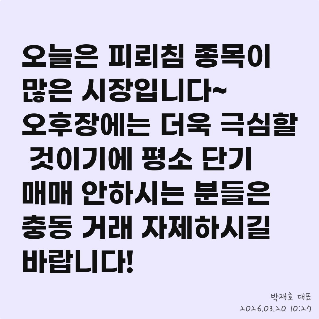 오늘은 피뢰침 종목이 많은 시장입니다~ 오후장에는 더욱 극심할 것이기에 평소 단기 매매 안하시는 분들은 충동 거래 자제하시길 바랍니다!