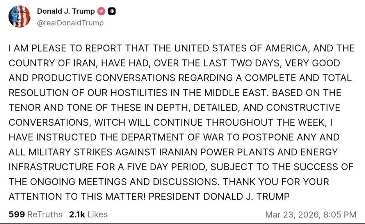 ​이번 주 내내 계속될 이 심도 있고 구체적이며 건설적인 대화의 흐름과 분위기를 바탕으로, 본인은 현재 진행 중인 회의와 논의가 성공적으로 이루어지는 것을 조건으로 이란의 발전소 및 에너지 인프라에 대한 일체의 군사적 타격을 5일간 연기할 것을 전쟁부(국방부)에 지시했습니다.