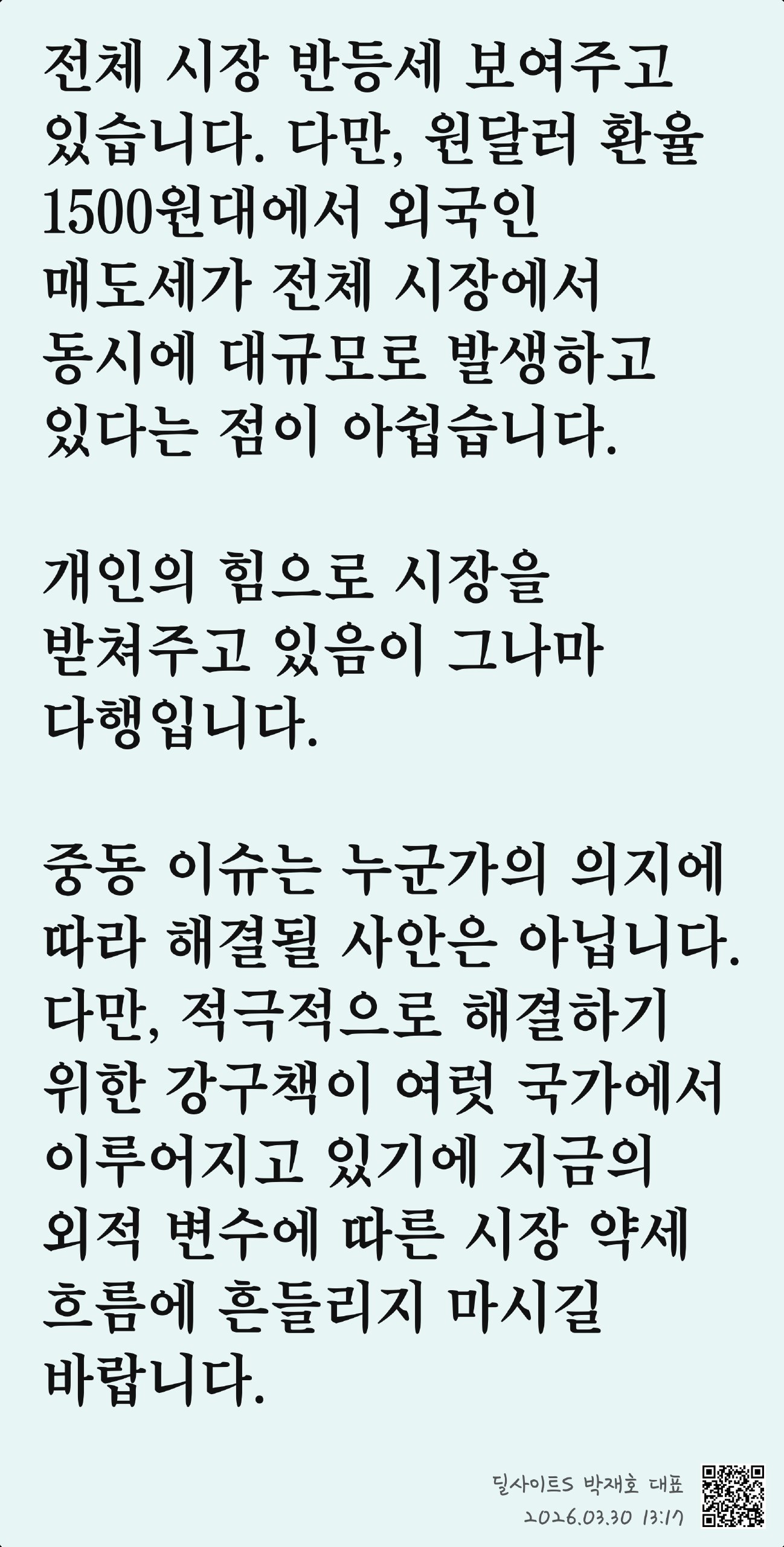 중동 이슈는 누군가의 의지에 따라 해결될 사안은 아닙니다. 다만, 적극적으로 해결하기 위한 강구책이 여럿 국가에서 이루어지고 있기에 지금의 외적 변수에 따른 시장 약세 흐름에 흔들리지 마시길 바랍니다.