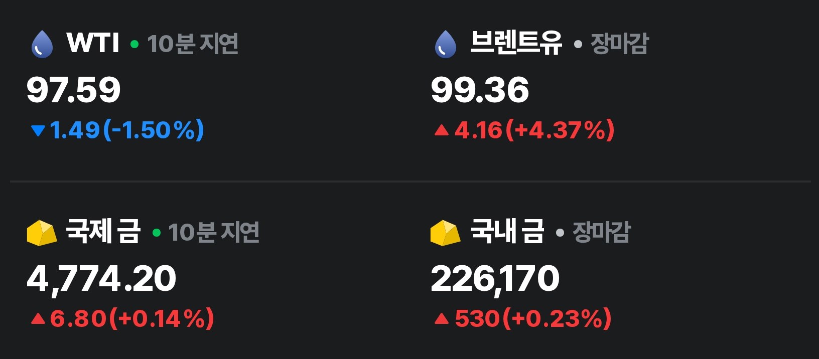 국제 유가는 90달러대로 하락하며 안정을 찾는 모습이다. 반면 중동 리스크 여파로 코스피는 하락 마감했으나 장 후반 낙폭을 줄였다.
