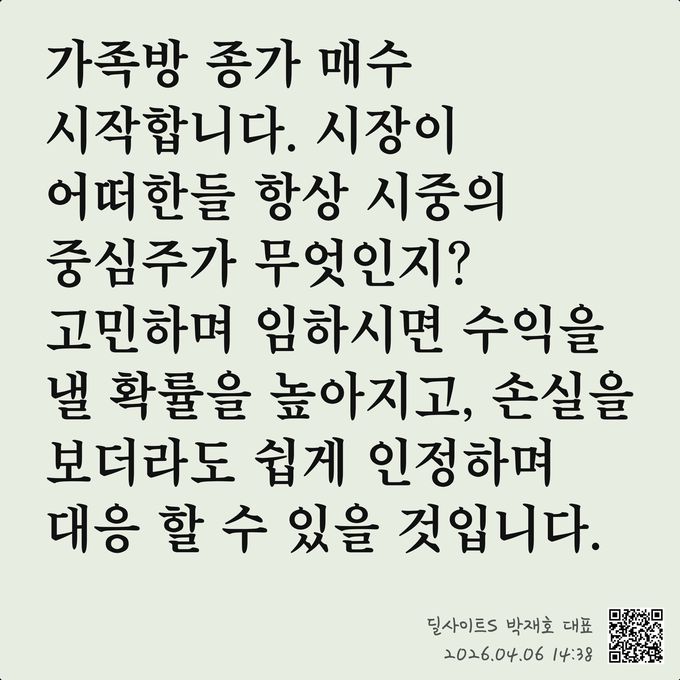 가족방 종가 매수 시작합니다. 시장이 어떠한들 항상 시중의 중심주가 무엇인지? 고민하며 임하시면 수익을 낼 확률을 높아지고, 손실을 보더라도 쉽게 인정하며 대응 할 수 있을 것입니다.