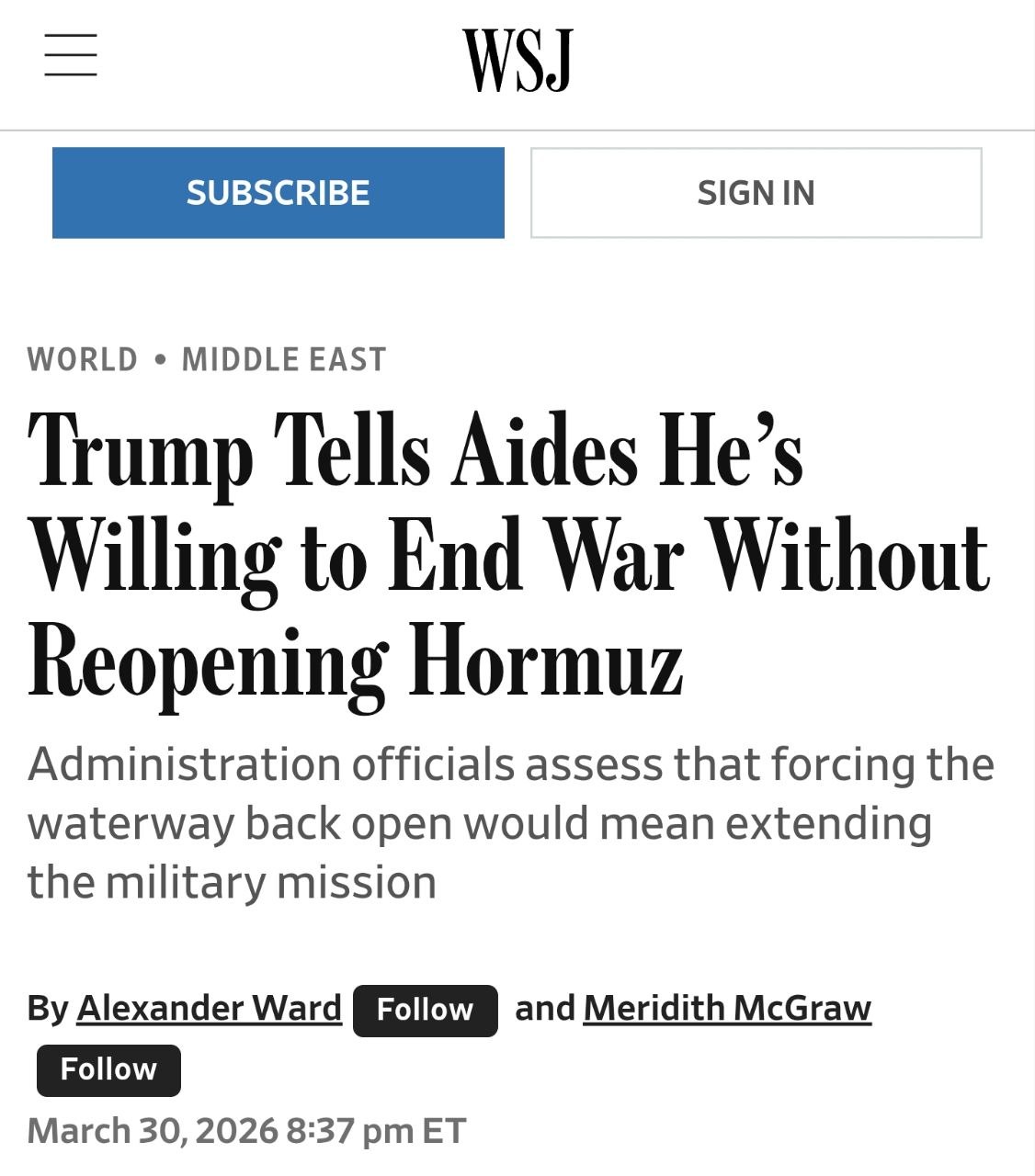[월스트리트저널(WSJ)] 도널드 트럼프 대통령이 호르무즈 해협이 사실상 폐쇄된 상태로 남더라도 현재 진행 중인 이란과의 전쟁을 끝낼 용의가 있다는 뜻을 참모들에게 밝힌 것으로 알려졌다.